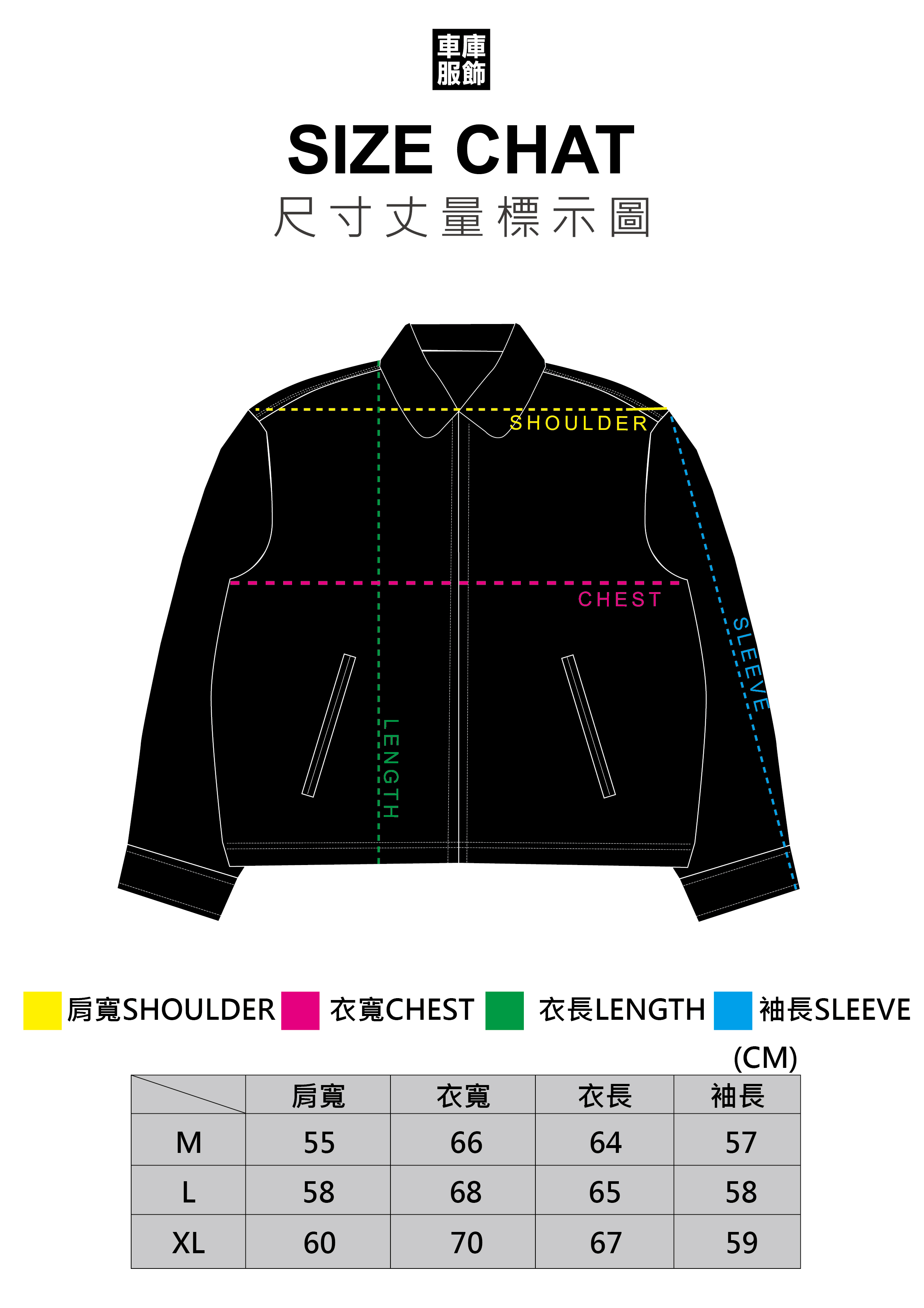 M : 肩寬55CM / 衣寬66CM / 衣長64CM / 袖長57CM