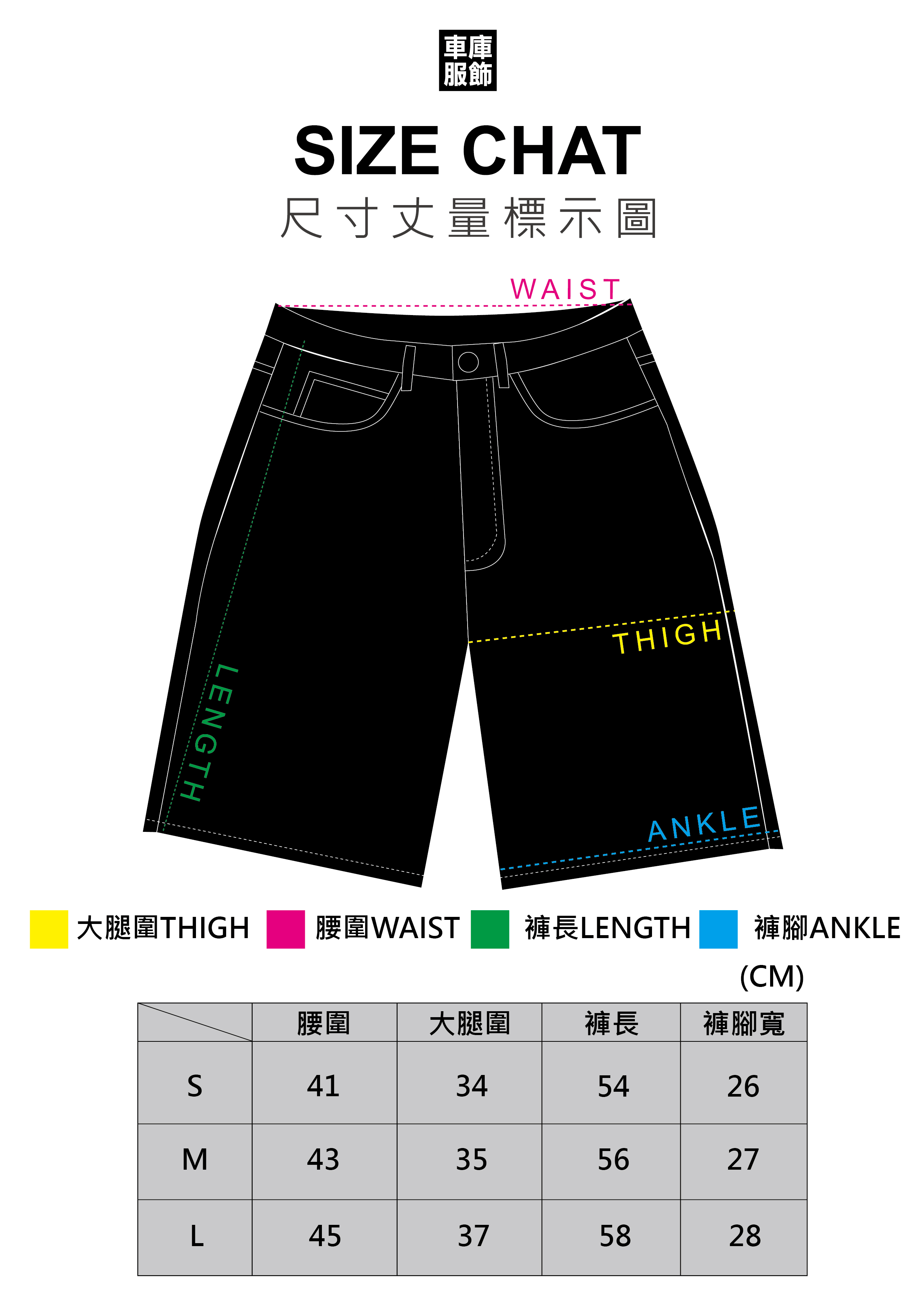 L 腰圍45CM 大腿寬37CM 褲長58CM 褲腳寬28CM